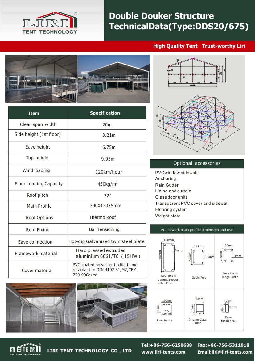 Double Decker is two storey clear span structure. It is a revolutionary breakthrough of the regular tent, which allows 200% usage of the ground. At the same time enables the division of multi-function easily of the interior space. From the upper leve; of the structure, a wide view is provided. It is good chioce for VIP lounge, movable office, luxury events, and so on.